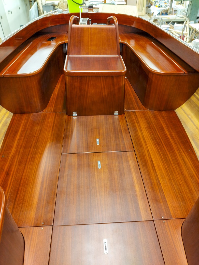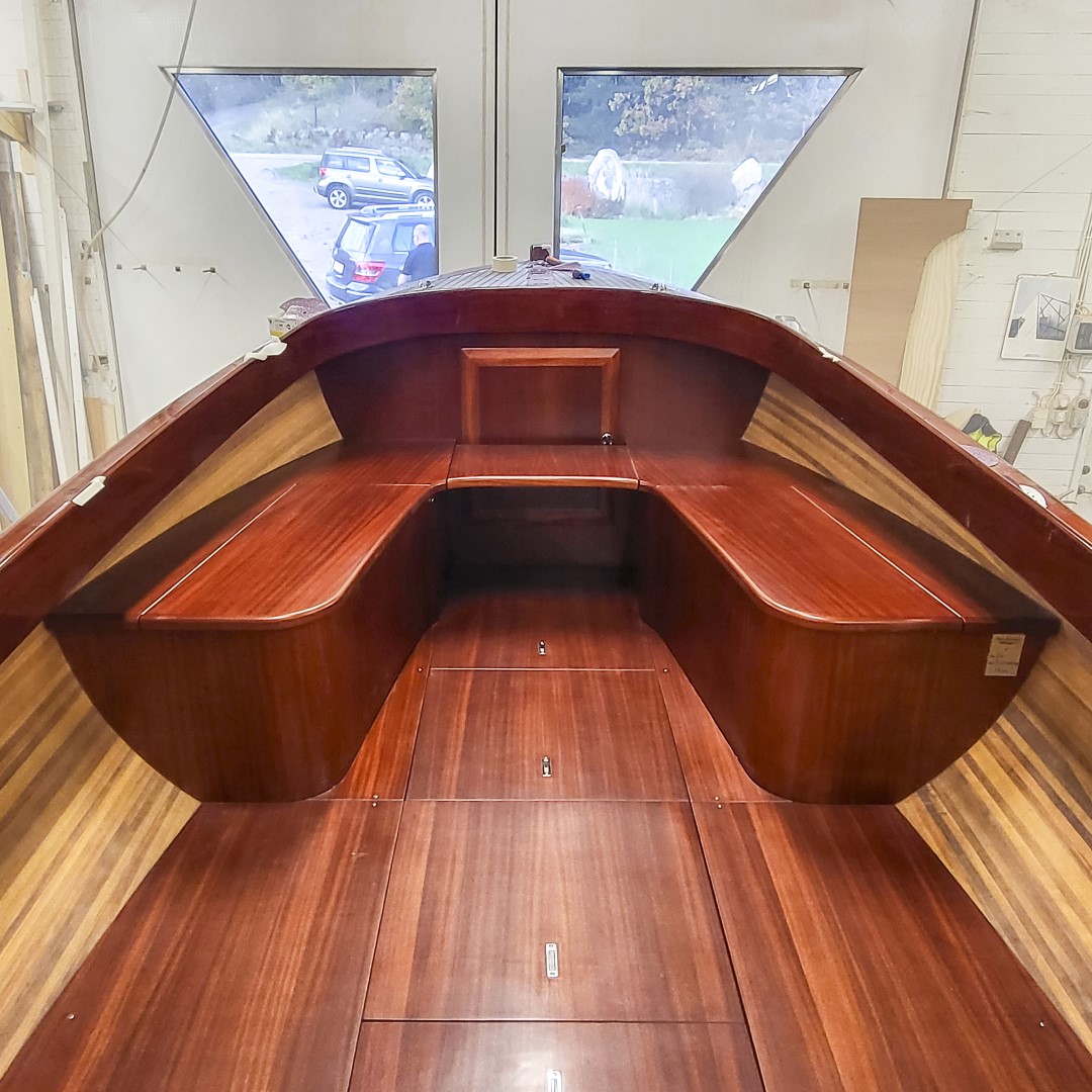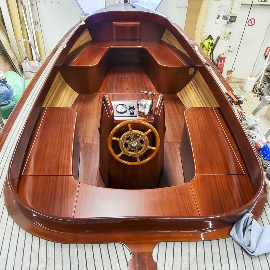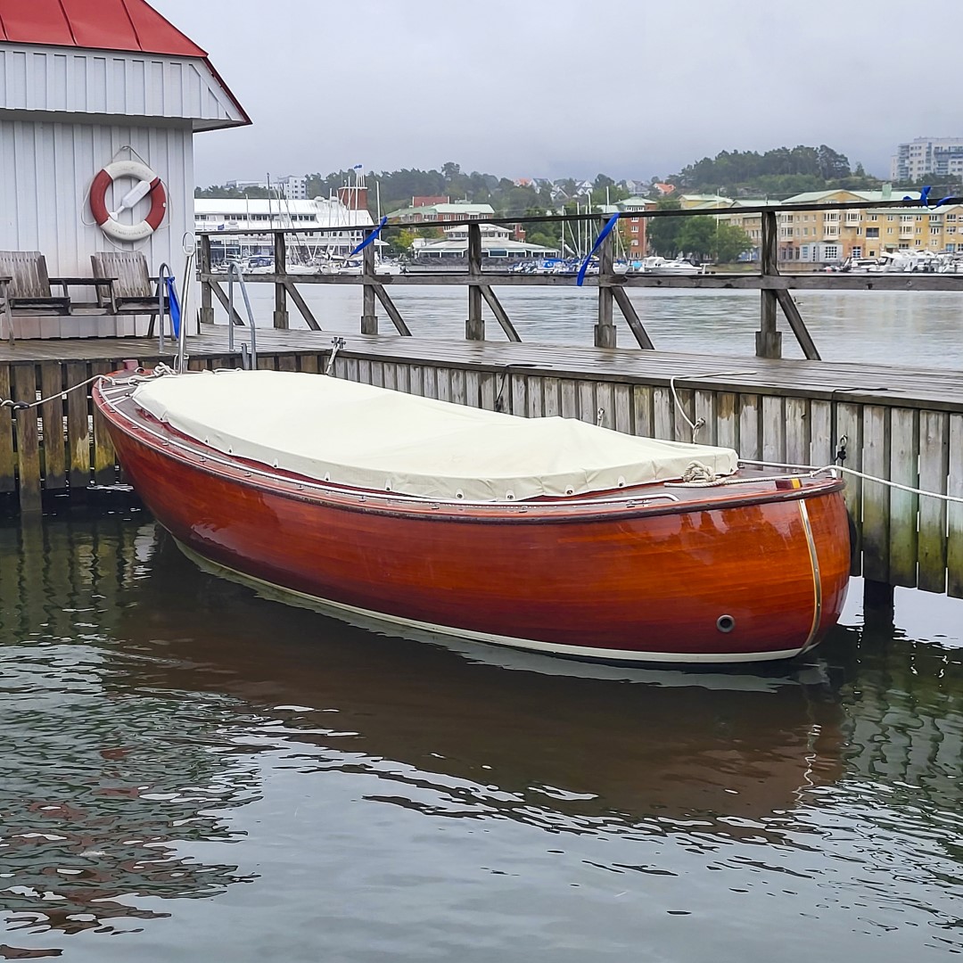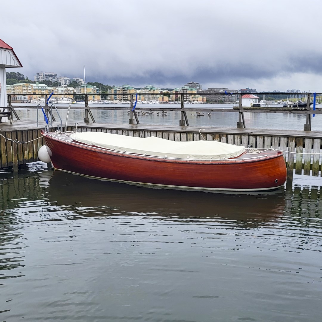 Jennipher, en 28 fots daycruiser. Designad av Ocke Mannerfelt. Sandwich konstruktion i glasfiber med ett tunnt magohnyfaner i epoxyn. Njut av ”träbåt” som inte behöver slipas och lackas!