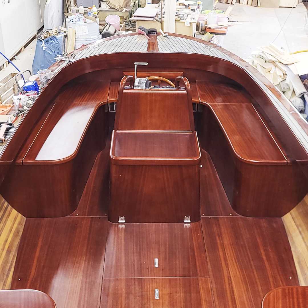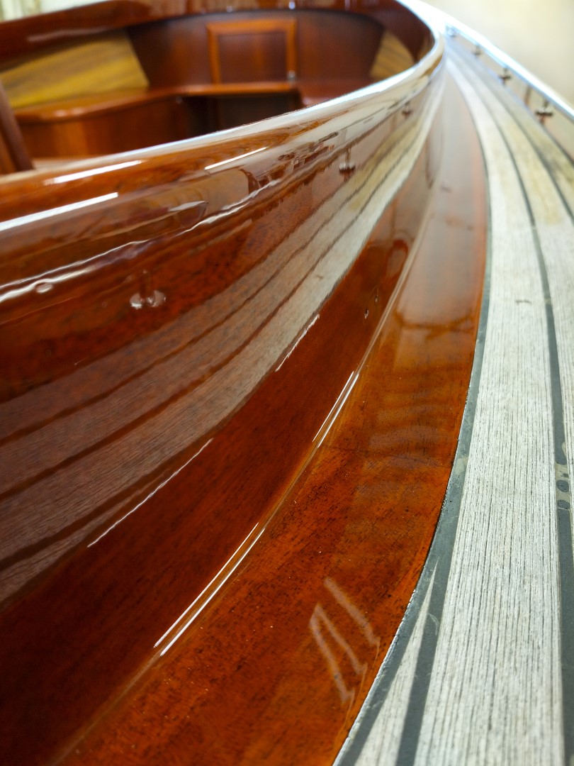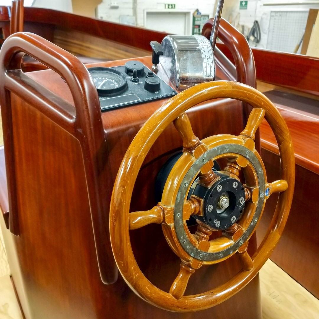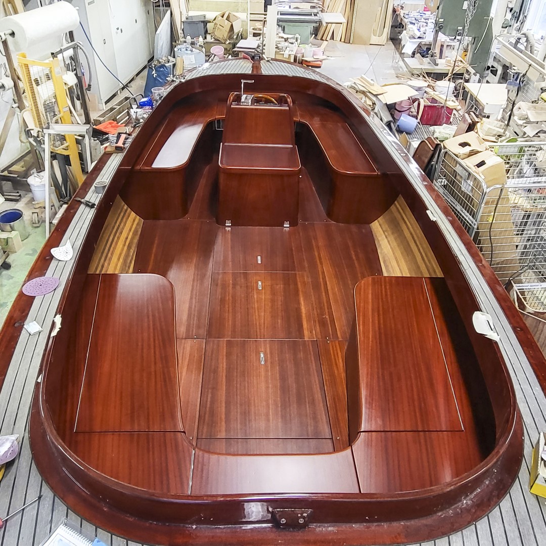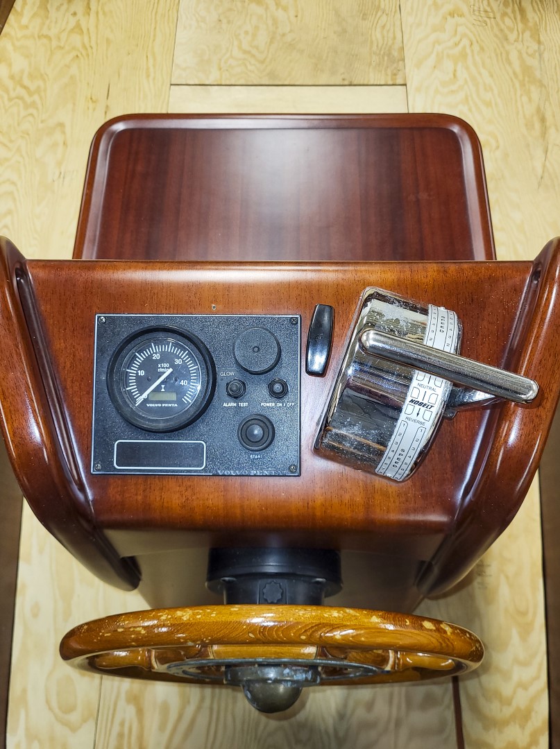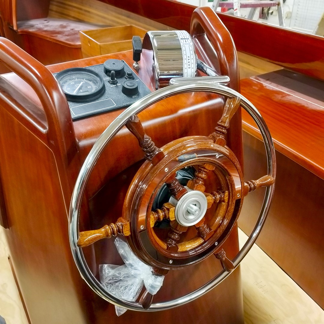 Jennipher, en 28 fots daycruiser. Designad av Ocke Mannerfelt. Sandwich konstruktion i glasfiber med ett tunnt magohnyfaner i epoxyn. Njut av ”träbåt” som inte behöver slipas och lackas!